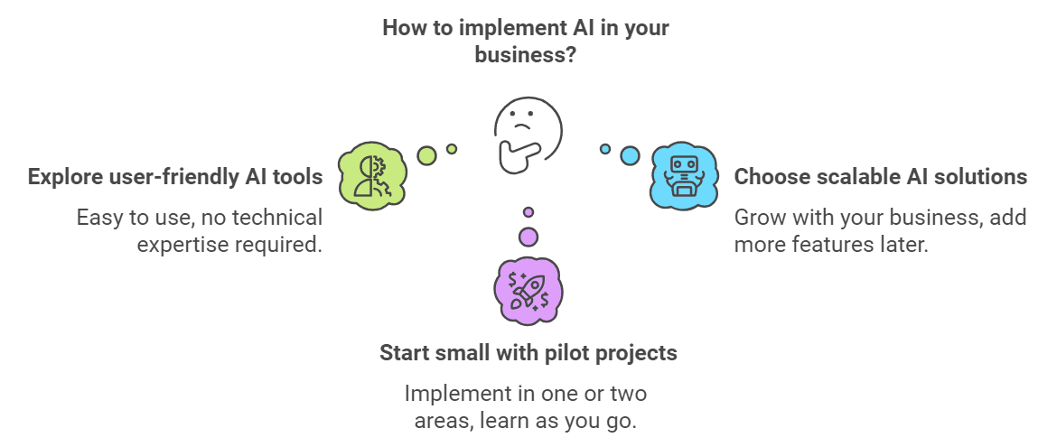 Start small with pilot projects. You don’t need to overhaul your entire operation in one go. Implement AI in one or two areas, such as automating customer service or managing your inventory, and learn as you go.