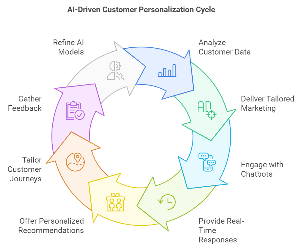 Tailored Marketing Efforts: AI can analyze customer data—like purchase history, browsing behavior, and even social media activity—to deliver targeted marketing messages that resonate with each individual. For example, if a customer frequently buys a certain type of product, AI can predict their next purchase and offer personalized recommendations or discounts. This increases the likelihood of repeat purchases and enhances customer loyalty.